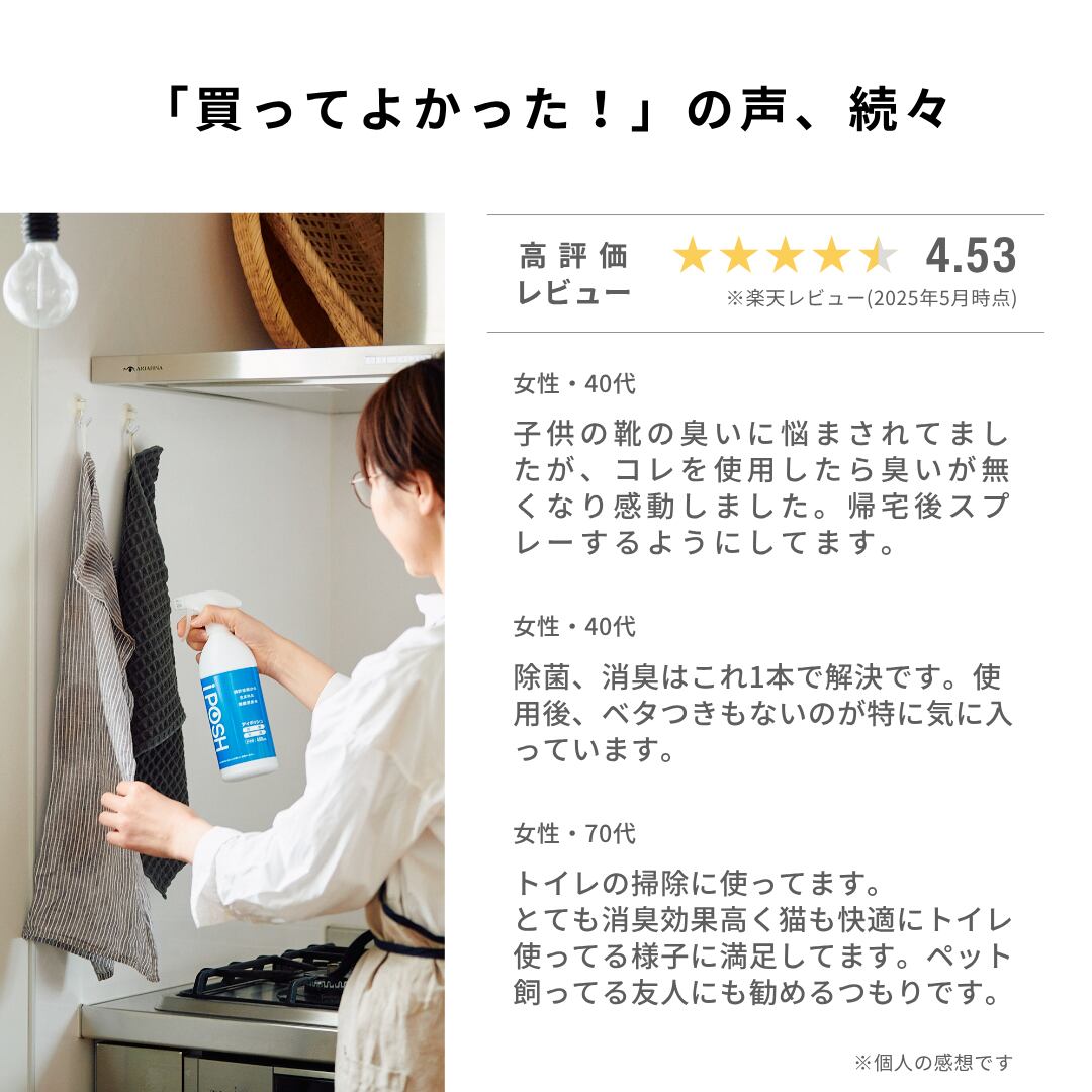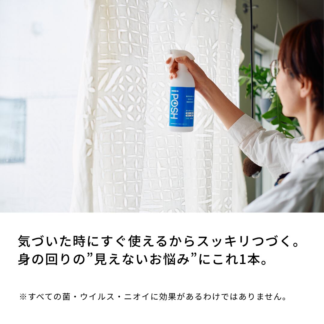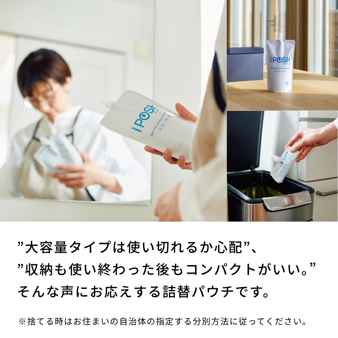 内容量:iPOSH詰替えパウチ400mL×3本 濃 度:200ppm 医療機関・福祉施設・教育施設など全国15,000件の採用実績! ●日常の衛生管理を簡単・効率的に● iPOSHはウイルスや菌、ニオイが気になるところに幅広くご使用いただける次亜塩素酸(弱酸性)の除菌消臭水です。 ご家庭をはじめ、病院やクリニックなどの医療機関や調剤薬局、介護施設、学校や保育園などの教育施設でも採用されています。 ※対象物により効果は異なります。 ※ウイルス・菌・ニオイのすべてを除去できるものではありません。